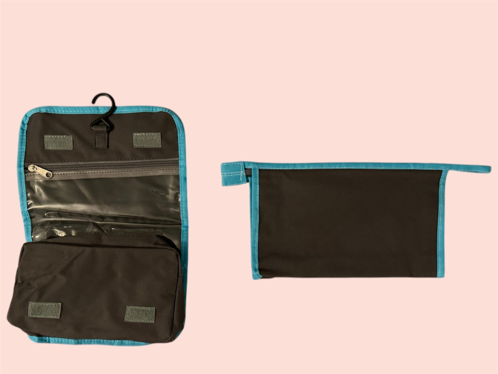 - D'une trousse en bleu et gris de 27 cm de largeur sur 16 cm de hauteur accompagnée d'une dernière trousse de voyage bleu et gris multi-tâches avec deux rangements intégrés à l'interieur et le crochet pour l'accrocher de 23 cm de largeur sur 18 cm de hauteur (une fois fermé).