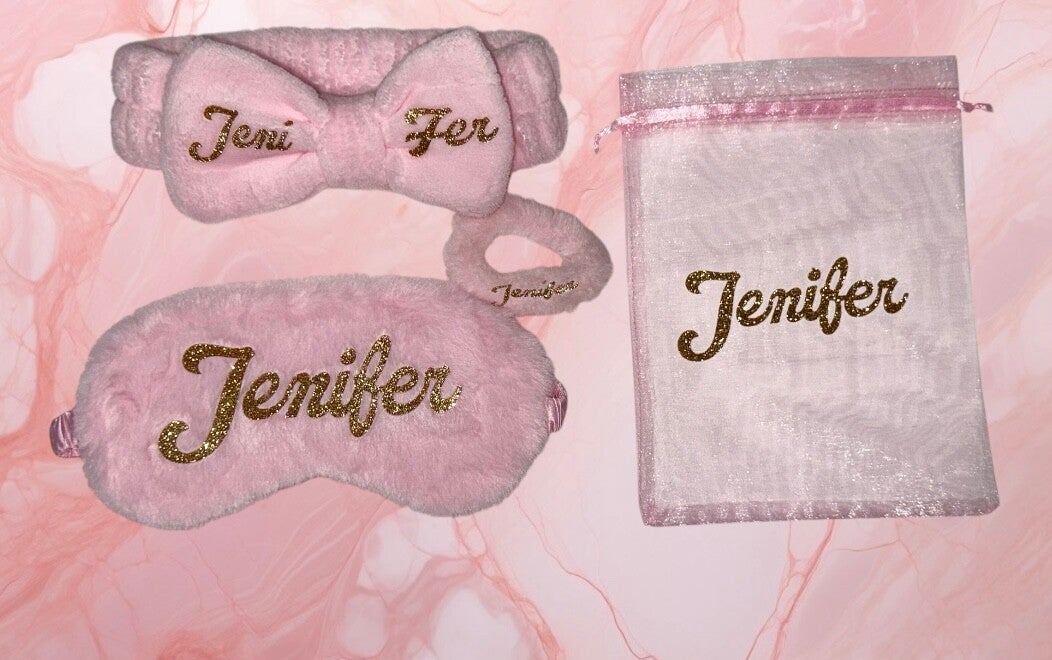 Personnaliser cet ensemble de beauté composé d'un bandeau pour les cheveux, un masque pour les yeux, d'un chouchou très doux et d'une pochette pour ranger le tout.
