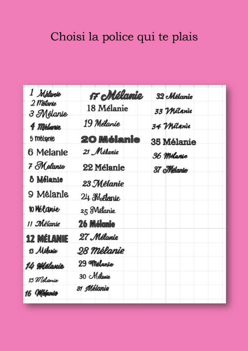 Choisissez ensuite, la représentation qui vous plais le plus. Choisissez l'écriture qui vous semble la plus jolie parmi les 37 propositions. Enfin, parmi les propositions de couleurs, choisissez la couleur de la représentation.